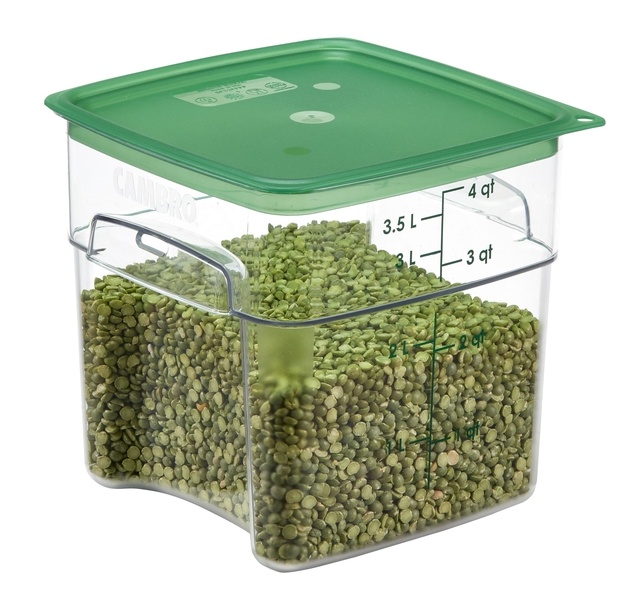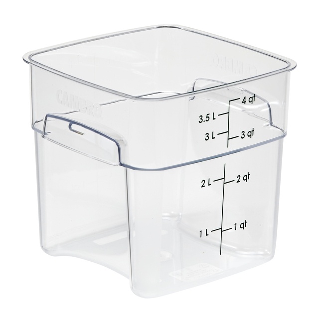* Breng een revolutie teweeg in uw keuken met de CamSquares FreshPro-serie voedselopslagcontainer van 1,9 liter van Cambro, gemaakt van duurzaam Camwear. Dankzij de geïntegreerde handgrepen neemt de container minder ruimte in beslag dan conventionele opbergmogelijkheden en kan indien nodig gemakkelijk worden getransporteerd. De afgeronde hoeken en het getextureerde handvat van de FreshPro zorgen voor veiliger vierzijdig schenken en gemakkelijker hanteren. Het kleurgecodeerde systeem, met bijpassende deksels (afzonderlijk verkrijgbaar), afvoeren en gemakkelijk leesbare schaalverdelingen, biedt inventarisoverzicht en gebruiksgemak, essentieel voor snelle keukens. En dankzij de constructie van polypropyleen is de container zeer duurzaam en bestand tegen vlekken, zuurschade en geurretentie. * Afmetingen: 187x185x185 mm. * Temperatuurbereik: -40°C tot +70°C. * Gewicht 370 gram. * Vaatwasserbestendig.