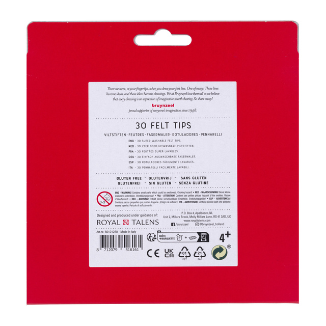 * Met de viltstiften van hoogwaardige kwaliteit van Bruynzeel kun je de mooiste tekeningen maken en de mooiste kleurplaten inkleuren! * Als je de stiften al een tijdje niet meer gebruikt hebt en ze een beetje uitgedroogd zijn, geef ze dan een tweede leven door ze in water te dompelen. * Deze set bevat 30 verschillende kleuren. * Geschikt voor kinderen vanaf 5 jaar. * Kenmerken: goede kleurafgifte, inkt op waterbasis, uitwasbaar uit de meeste textielsoorten en glutenvrij.