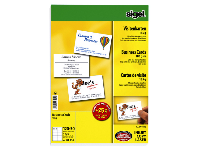* Design visitekaartjes. * 3C technologie met gladde kanten rondom. * Zonder perforatie. * Gemakkelijk ontwerpen, printen en losmaken. * 10 kaartjes per vel op A4-formaat 85x55 mm. * Geschikt voor inkjet-, laserprinter en kopieermachine.