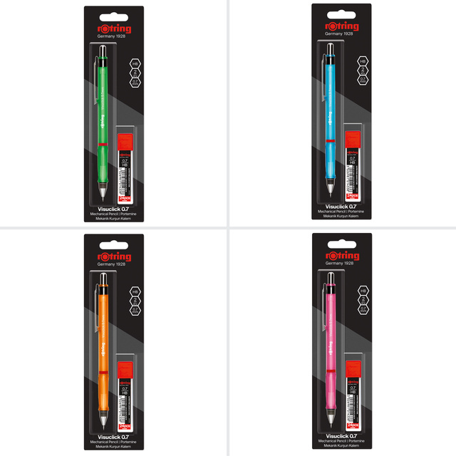 * Visuclick is een mechanisch potlood met een snelle klikactie van rOtring dat doelgericht ontworpen is als creatief gereedschap maar met precisie is ontworpen voor dynamische en optimale schrijfprestaties. * Visuclick heeft een driehoekig lichaam om je creatieve gedachten en visies met een ontspannen gevoel te communiceren. * Alle Visuclicks hebben een lijnbreedte van 0.7mm. * Geladen met een hoogpolymeer 2B lood en bevat ook nog extra lood (24 stuks) om je potlood toekomstgericht verder op te vullen. * Deze doos met 12 blisters bevat een assortiment van de 4 kleuren (blauw, rood, groen en oranje).