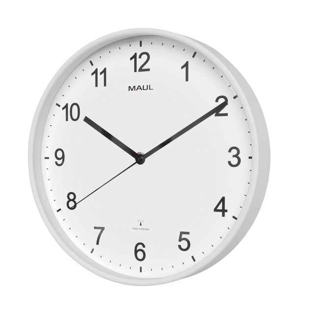 * MAUL Sprint is een tendy designklok in coole witte look, let op deze is ook alleen leverbaar als een Radiogestuurde klok. * Lettertype zeer goed leesbaar. * Slank frame in wit van onbreekbare kunststof. * Past goed in de werkkamer thuis of op kantoor. * Afdekking van plat mineraalglas. * Batterijgebruik, inclusief één 1,5 V (AA). * Arabische cijfers in zwart. * Cijferhoogte 2,5 cm. * Wijzerplaat in wit met minuut- en uureenheden. * As en wijzers in zwart. * Automatische synchronisatie met het DCF77-signaal, automatische tijdsverandering bij signaalstoringen, als gevolg van geologische situaties of metalen constructies in gebouwen zijn mogelijk. * Bereik van het signaal ongeveer 1500 km vanaf de zenderlocatie. * In deze gevallen is handmatige afstelling noodzakelijk. * Wandmontage via een ophangoog.