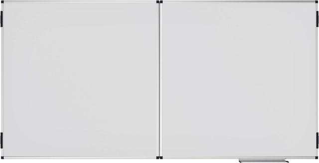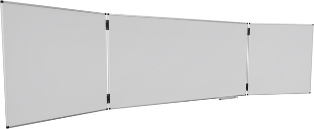 * Uitklapbaar, dubbelzijdig magnetisch whiteboard met veel ruimte om te schrijven, notities en foto's te bevestigen in vergaderruimtes of klaslokalen. * Twee dubbelzijdige, uitklapbare zijvleugels die met clips op hun plaats kunnen worden vergrendeld. * Geschikt om met droog uitwisbare whiteboard markers te beschrijven. * Magnetisch oppervlak van geëmailleerd e3 keramisch staal, dat de productcertificering Bronze van Cradle to Cradle Certified™ heeft. * Aluminium frame met grijze kunststof hoekdoppen (Pantone 433C). * Afleggoot (30cm), montageset en montagehandleiding meegeleverd. * Legamaster biedt een breed scala aan accessoires: Wij adviseren de 77-delige Professional Whiteboard Accessories Set en de droog uitwisbare board markers.