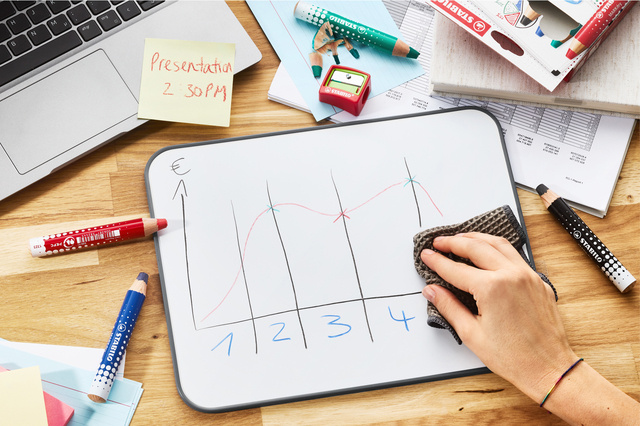 * STABILO MARKdry: de nieuwe generatie markers voor whiteboard en papier. * Naast kantoren worden flipcharts en whiteboards tegenwoordig ook veel gebruikt op scholen. * Waar eerst steeds gewisseld moest worden van stift om te kunnen schrijven op papier óf whiteboard, is er nu één oplossing voor beide: de STABILO MARKdry. * Deze houten marker schrijft zowel op papier als op whiteboards. * De marker is oplosmiddelvrij en gemaakt van 100% PEFC-gecertificeerd hout. * Het kan gemakkelijk zowel nat als droog worden uitgeveegd van whiteboards. * Een echte productinnovatie, deze inktloze marker droogt nooit uit en garandeert een krachtige, constante kleurafgifte tot de laatste streek en is altijd direct klaar voor gebruik. * Niks is zo vervelend dan voor de klas of je collega’s te staan naast je whiteboard of flipchart en je stift schrijft niet, omdat deze is uitgedroogd of leeggeschreven. * Dit gebeurt regelmatig bij gewone markers, maar zal niet gebeuren met de STABILO MARKdry: Uitdrogen? Nooit!* Gebruikers kunnen genieten van alle voordelen van deze houten marker: een comfortabele grip, uitstekende dekking, lange levensduur dankzij de slijpoptie, eenvoudig schrijven op whiteboards én papier.